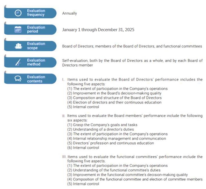 To enhance the Board functions and to improve the operation efficiency of the Board of Directors, a system of performance evaluation and policy is established. The scope of the evaluation includes the performance evaluation of the Board of Directors as a whole, individual Board members and functional committees. The evaluation methods include internal self-assessment by the Board of Directors, self-assessment by Board members, peer assessment, appointment of external professional organizations, experts or other appropriate methods for performance evaluation.